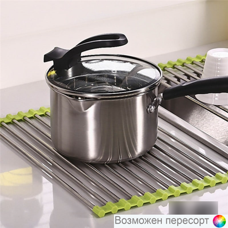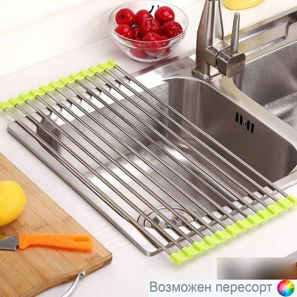 Складная полка-сушилка для посуды – новое изобретение ученых, которое позволяет сэкономить на кухне много места. Сушилка изготовлена из стержней нержавеющей стали, которые соединены силиконовой накладкой. Такая уникальная конструкция позволяет сушить посуду прямо над раковиной. Со складной полкой-сушилкой у Вас больше не возникнет проблем с местом для посуды. Просто разложите сушилку над раковиной и расставьте на ней посуду. Сушилка подходит для всех типов посуды: тарелок, кастрюль, стаканов. После того, как посуда высохла, Вы можете свернуть сушилку в удобный рулон и убрать ее на полку. В сложенном виде она довольно компактная и не занимает много места. Сушилку можно использовать как подставку под горячее. Она защитит деликатные поверхности от воздействия температуры, а силиконовая накладка предотвратит появление царапин. Такая сушилка станет отличным решением для любой кухни. Подходит для сушки посуды, а также для подготовки фруктов и овощей для соков или приготовления других блюд. Разложите сушилку на раковине. Выложите на нее фрукты или овощи, которые необходимо помыть. Промойте их и оставьте на полке некоторое время. Вы можете приготовить подходящую посуду для них, пока будет стекать лишняя вода. Теперь на вашем столе не будут скапливаться лужи после мытья посуды или овощей.