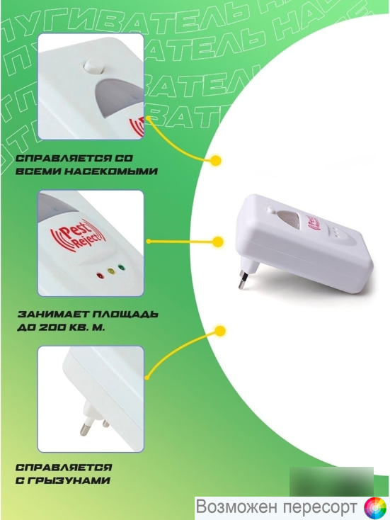 Ультразвуковой отпугиватель мышей, тараканов и комаров Pest Reject - это новейшая разработка, помогающая эффективно избавиться от насекомых, клопов, мух, грызунов, тараканов и комаров. Устройство Pest Reject - это надежная защитита Вашего дома от муравьев, грызунов и насекомых. Прибор работает по принципу создания двойного действия против вредителей в виде ультразвука и электромагнитных импульсов. Отличительная черта устройства - действие в отдаленных местах, где нет доступа для человека: под половицами или внутри стен. Совершенно безопасный для людей и домашних любимцев. При нормальном рабочем режиме должны светиться два индикатора: зеленый - ультразвук, красный - электромагнит. Отличная ловушка для клопов, крыс, мышей, грызунов, мошек. Широкий спектр воздействия позволяет избавиться от пауков, тараканов, муравьев, жуков, комаров, мух. Pest избавит Вас от вредителей.